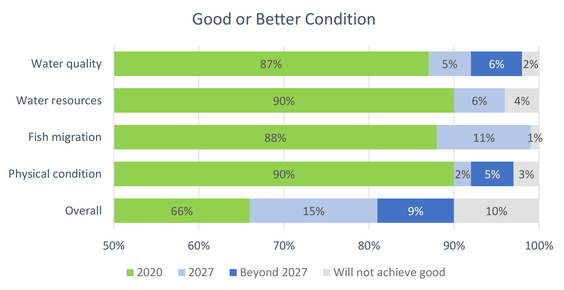 Scottish Ministers, SEPA and a range of public bodies have a legal duty to secure compliance with the WFD. This includes protecting the water environment and aiming to improve to good condition by 2027. The diagram shows the current status of the different themes in the RBMP, and the targets set for future years. Targets set for “beyond 2027” are for water bodies where we know there will be time needed for the ecology to recover.