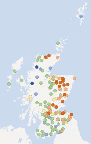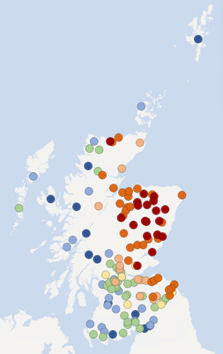 The maps below show recent groundwater and loch level compared to the long-term record at each individual station. Level is reported as high or low compared to the typical (‘normal’) level range for the time of year.