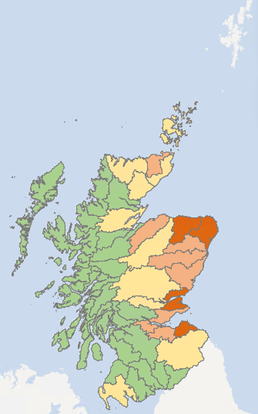 The Deveron, Ythan, Don (Aberdeenshire), Esk, Firth of Tay and Tyne catchments remain at Moderate Water Scarcity.