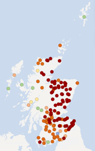 The last month of rainfall shows mostly normal conditions across Scotland. Wet conditions are present locally to the north of the great glen, while quite dry conditions are observed in some parts of the Outer Hebrides, the northeast and the central belt. River flows over the past 30 days continue to display an east to west split across Scotland, with eastern areas seeing low to very low flows, and western areas and the Northern Isles generally showing normal conditions.