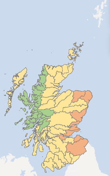The river catchments of the Shin, Naver, Conon, Spey, Deveron, Ythan, Don (Aberdeenshire), Dee (Aberdeenshire), Esk, Firth of Tay, Firth of Forth, Almond, Tyne (Lothian), Tweed, Esk (Dumfriesshire), Annan and Thurso remain at Alert.