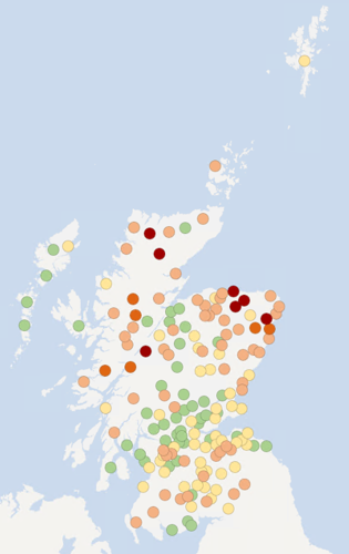 The maps below show groundwater and loch level compared to the long-term record at each individual station. Level is reported as high or low compared to the typical (‘normal’) level range for the time of year.