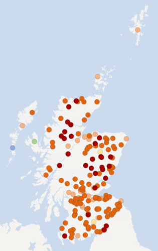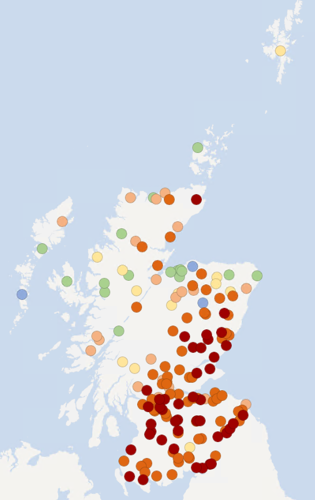 April continued to be a dry month for many parts of Scotland, particularly in the east. Parts of Aberdeenshire recorded less than a third of the average monthly rainfall for April. Many areas have now experienced prolonged periods of below average rainfall. Due to this continued dry weather, the water scarcity situation has deteriorated in many areas. As a result the Conon, Spey, Deveron, Ythan, Don (Aberdeenshire), Dee (Aberdeen), Esk, Firth of Tay, Firth of Forth, Almond, Tyne (Lothian), Tweed, Esk (Dumfriesshire), Annan and Thurso have been raised to Alert level. River levels in the Shin and Naver catchments remain extremely low and therefore remain at Alert.