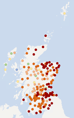 This map shows this week’s soil moisture deficit. This is obtained from the Met Office Rainfall and Evaporation Calculation System (MORECS). Ground conditions are quite dry across parts of the north, east and southwest of Scotland. Elsewhere there is no soil moisture deficit.