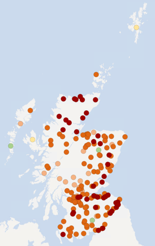 The Conon, Spey, Deveron, Ythan, Don (Aberdeenshire), Dee (Aberdeenshire), Esk, Firth of Tay, Firth of Forth, Almond, Tyne (Lothian), Tweed, Esk (Dumfriesshire), Annan and Thurso have been raised to Alert. The Shin and Naver catchments remain at Alert. Shetland has been raised to Early Warning while the Inner Hebrides has recovered to Normal Conditions. The rest of the country remains at Early Warning.