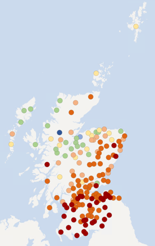 Groundwater levels, from our monitoring points, are generally low to very low for the time of year. This is due to the limited recharge over the winter period. Groundwater levels are lower than levels recorded at the beginning of April 2022, particularly in Fife and Angus. Low groundwater levels in April 2022 were followed by a period of drought in summer 2022. Only groundwater levels in the Moray area are above normal for the time of year which reflects the higher-than-average rainfall in this area over the winter period.