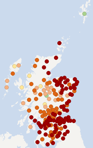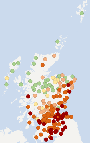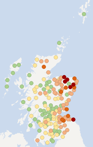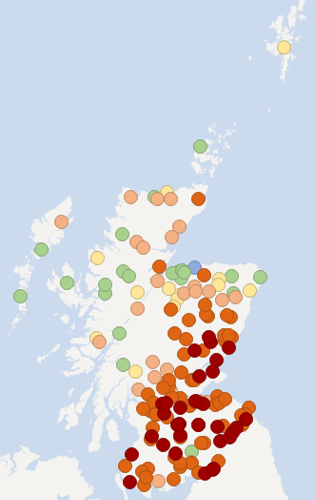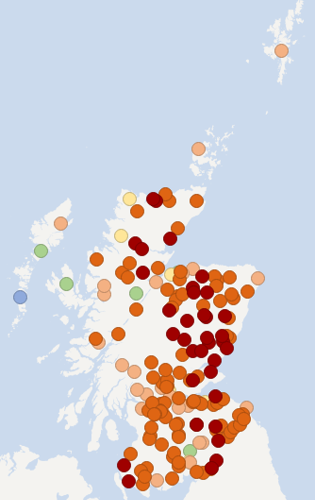 The maps below show recent groundwater and loch level compared to the long-term record at each individual station. Level is reported as high or low compared to the typical (‘normal’) level range for the time of year.
