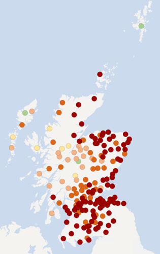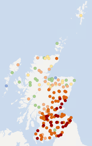 The river catchments of the Spey, Tay, Annan, Nith, Dee (Galloway) and Cree have been raised to Moderate scarcity. The Deveron, Ythan, Don (Aberdeenshire), Dee (Aberdeen), Esk, Firth of Tay, Firth of Forth, Almond, Tyne (Lothian), Tweed, and Esk (Dumfriesshire) remain at Moderate scarcity. Most of the rest of the country remains at Alert, except the Inner Hebrides and Outer Hebrides which are at Early Warning.