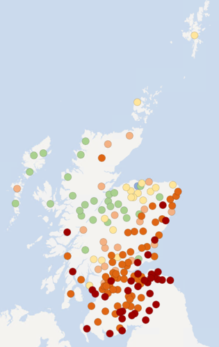 The maps below show recent groundwater and loch level compared to the long-term record at each individual station. Level is reported as high or low compared to the typical (‘normal’) level range for the time of year.