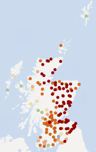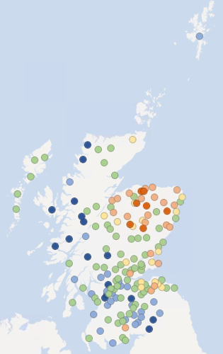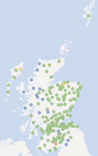 The maps below show recent groundwater and loch level compared to the long-term record at each individual station. Level is reported as high or low compared to the typical (‘normal’) level range for the time of year.