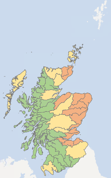 The Deveron, Ythan, Don (Aberdeenshire), Esk, Firth of Tay and Tyne (Lothian) river catchments remain at Moderate Water Scarcity.