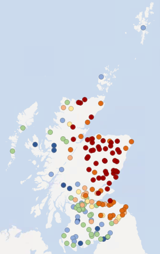 Based on the June average loch levels from our monitoring points show very low levels in the northeast of Scotland with loch levels elsewhere between normal and very high.