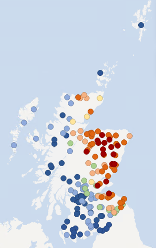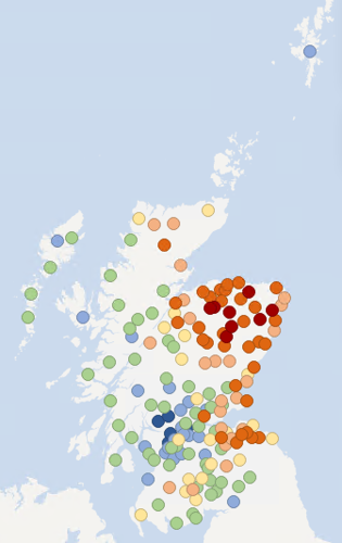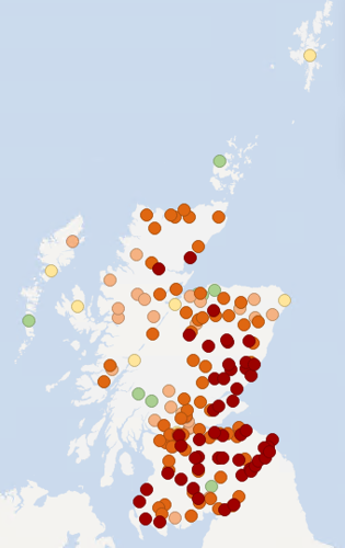 The maps below show recent groundwater and loch level compared to the long-term record at each individual station. Level is reported as high or low compared to the typical (‘normal’) level range for the time of year.