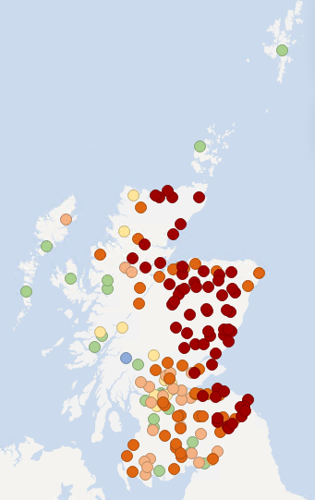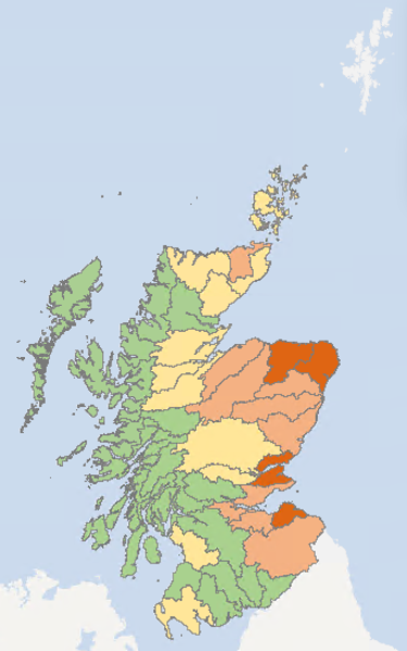 The Spey, Deveron, Ythan, Don (Aberdeenshire), Dee (Aberdeen), Esk, Firth of Tay and Tyne (Lothian) river catchments remain at Moderate Water Scarcity. The Wick, Helmsdale, Findhorn, Firth of Forth, Almond and Tweed catchments remain at Alert. The Naver area has recovered to Early Warning. Further recovery means that the rest of the country is at Early Warning or Normal Conditions.