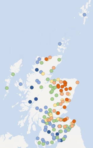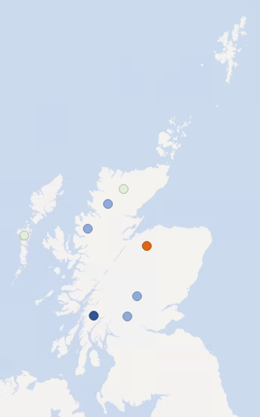 Based on the June average loch levels from our monitoring points show very low levels in the northeast of Scotland with loch levels elsewhere between normal and very high.