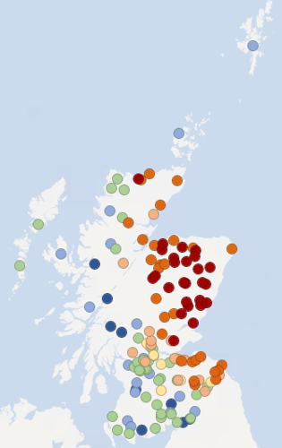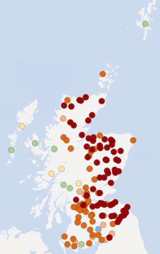The last month of rainfall shows mostly normal conditions across Scotland. Wet conditions are present in a part of western Scotland, while quite dry conditions are observed in some parts of the Outer Hebrides, central and eastern Scotland. River flows over the past 30 days continue to display an east to west split across Scotland. Eastern areas seeing very low to quite low flows, while western areas and the Northern Isles generally have normal to very high flows.