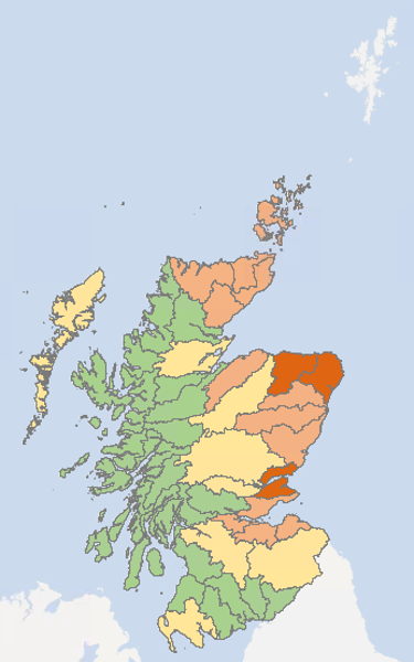 The Deveron, Ythan, Don (Aberdeenshire), Esk, Firth of Tay and the Tyne (Lothian) river catchments remain at Moderate Water Scarcity.